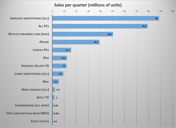 For the sake of comparison, I put together this chart listing recent sales or shipments for a single quarter for some well-known brands.